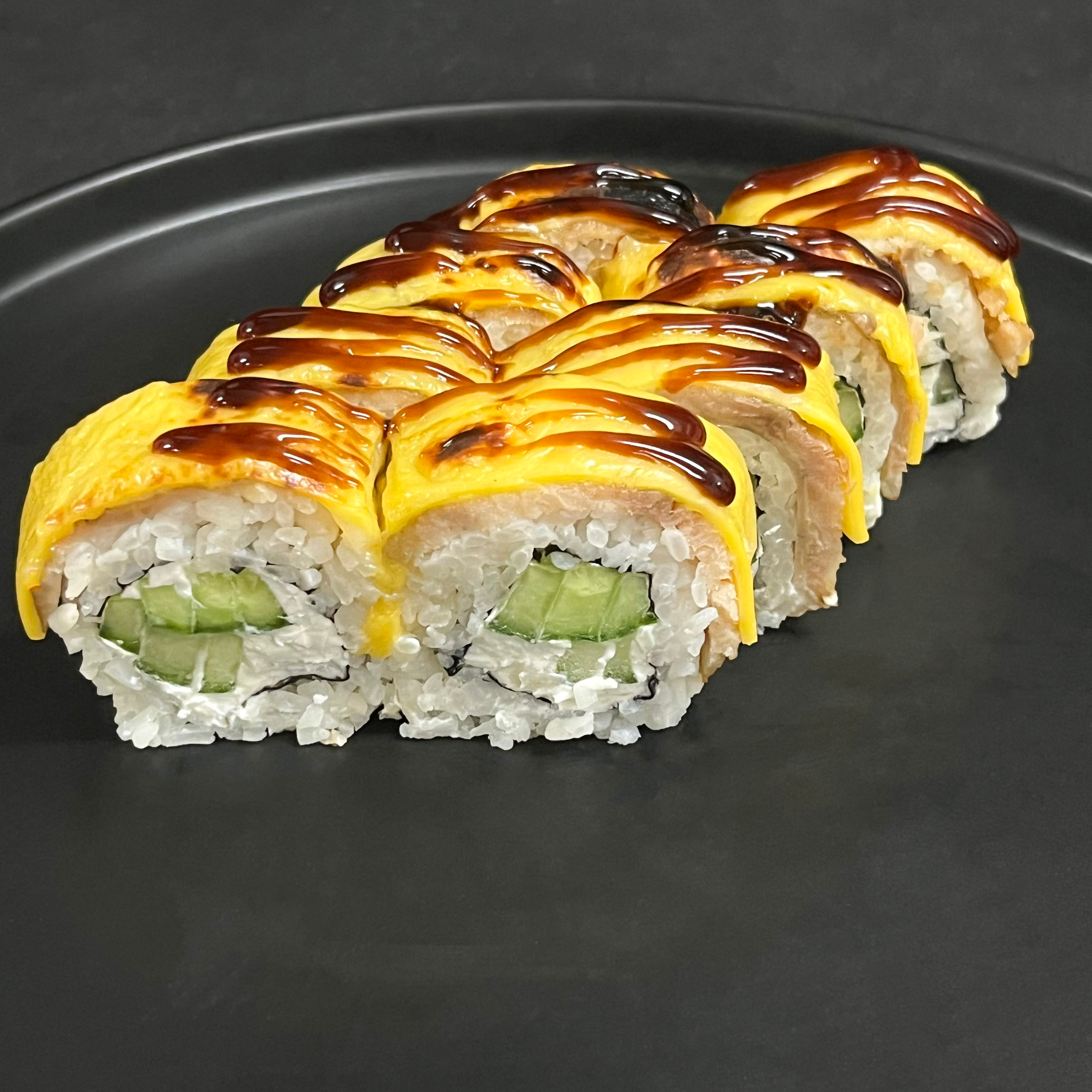 рис, нори, угорь, сыр чеддер, сыр креметте, огурец, соус унаги