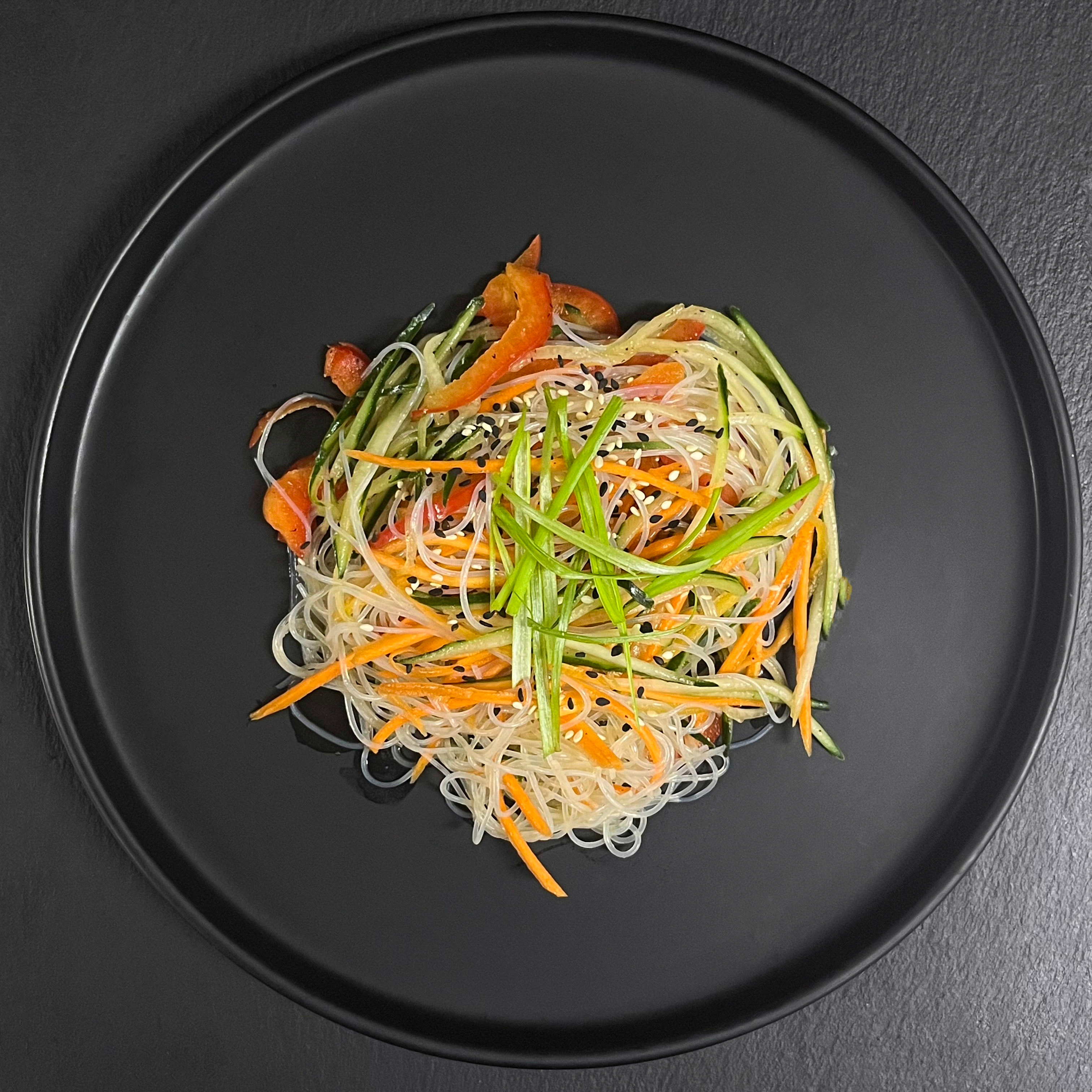 рисовая вермишель, морковь, огурец, болгарский перец, масло чесночное, лимонный сок, соевый соус