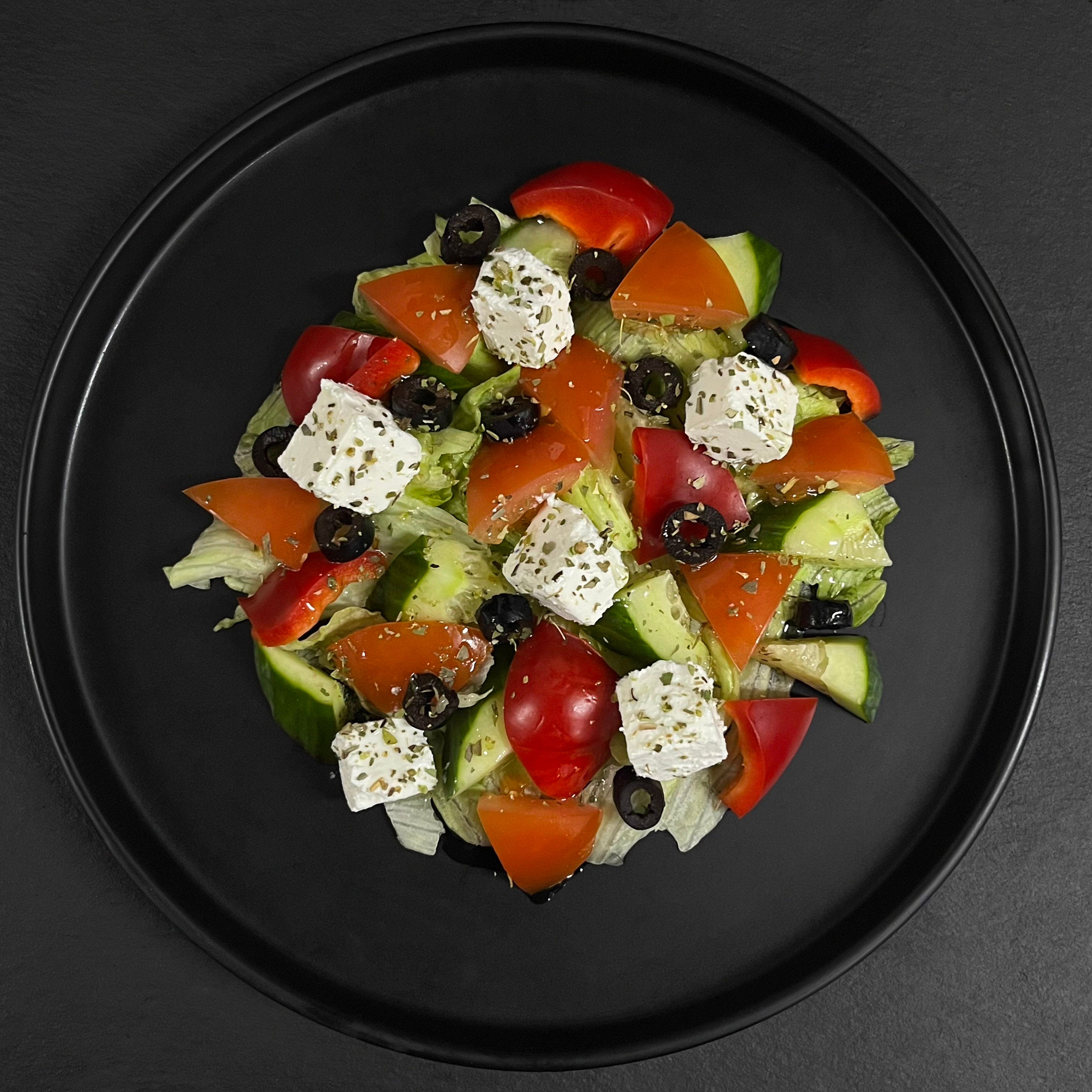 айсберг, помидор, огурец, болгарский перец, маслины, сыр фета, орегано, сок лимона, оливковое масло