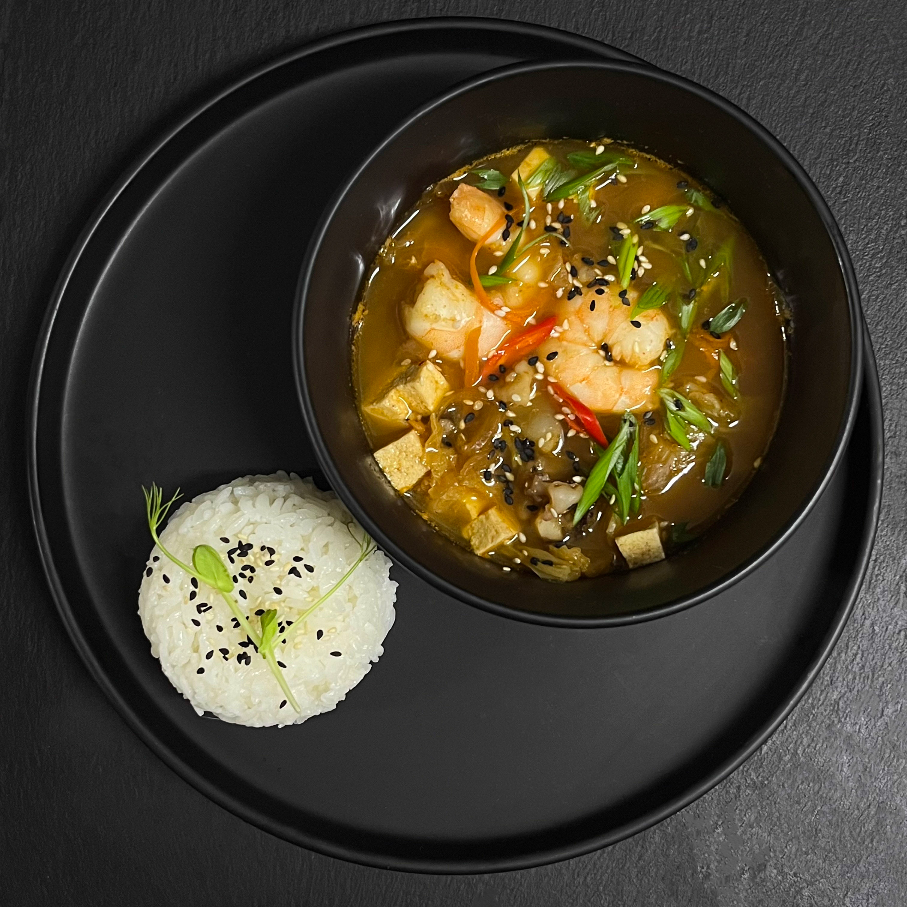 куриный бульон, морской коктейль, тигровая креветка, рис, тофу, капуста кимчи, зелёный лук, перец чили, соус соевый, соус кимчи