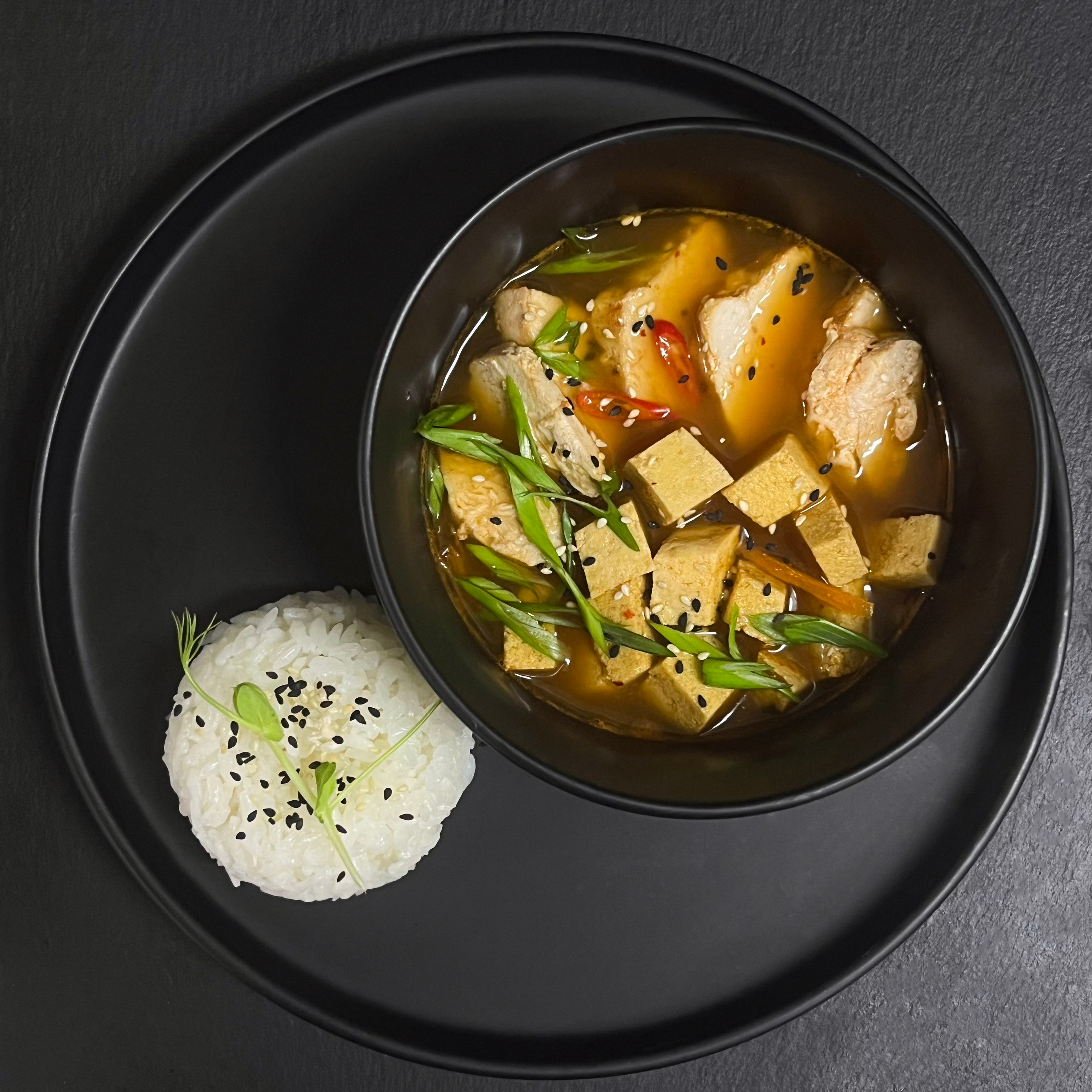 куриный бульон, курица запечённая, рис, тофу, капуста кимчи, перец чили, зелёный лук, соус соевый, соус кимчи