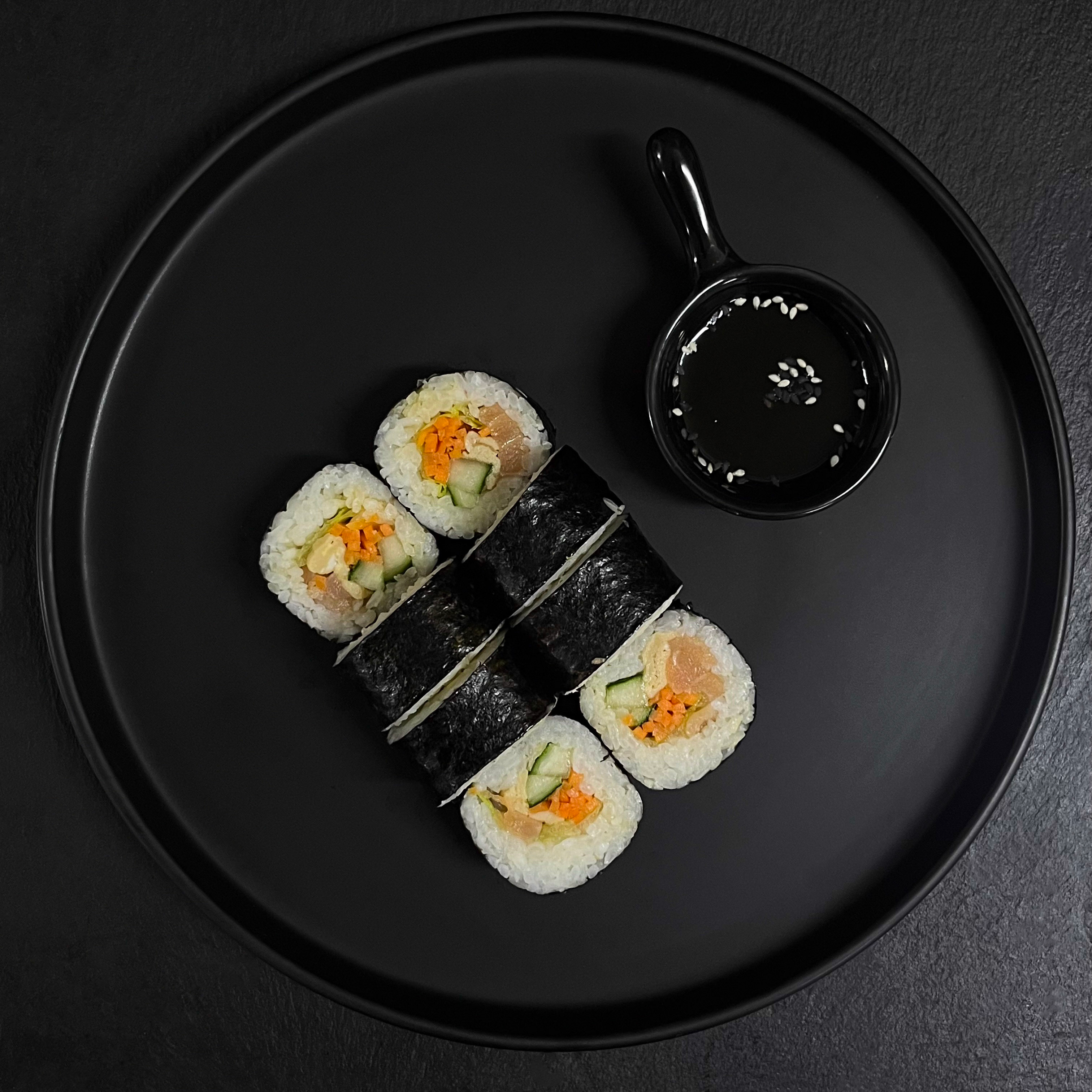 рис, нори, японский омлет, лосось, морковь, айсберг, огурец, соус тай-тай (входит в подачу к данному блюду)