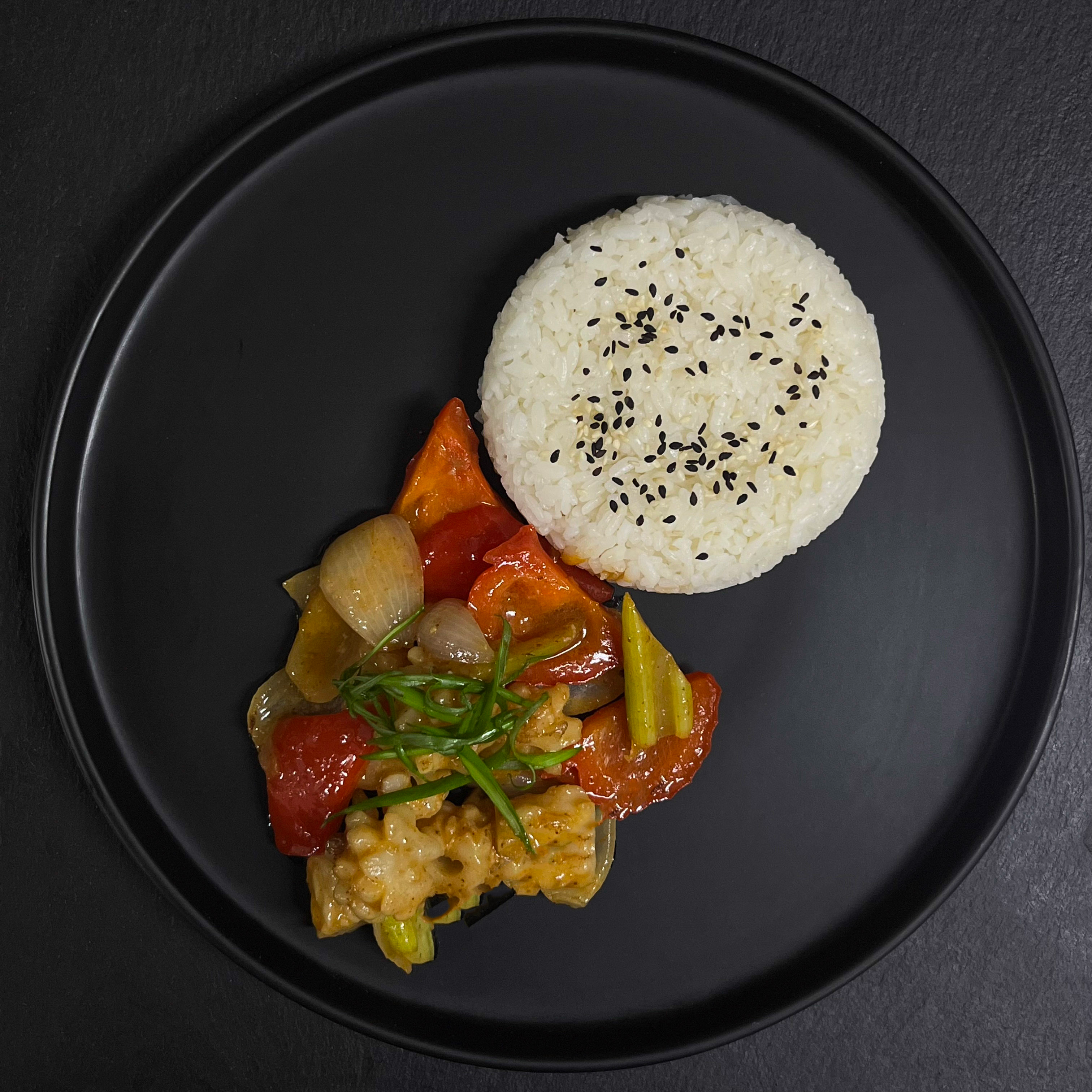 рис, кальмар, болгарский перец, лук репчатый, сельдерей, имбирь, масло подсолнечное, масло кунжутное, масло чесночное, зелёный лук, соус пад тай