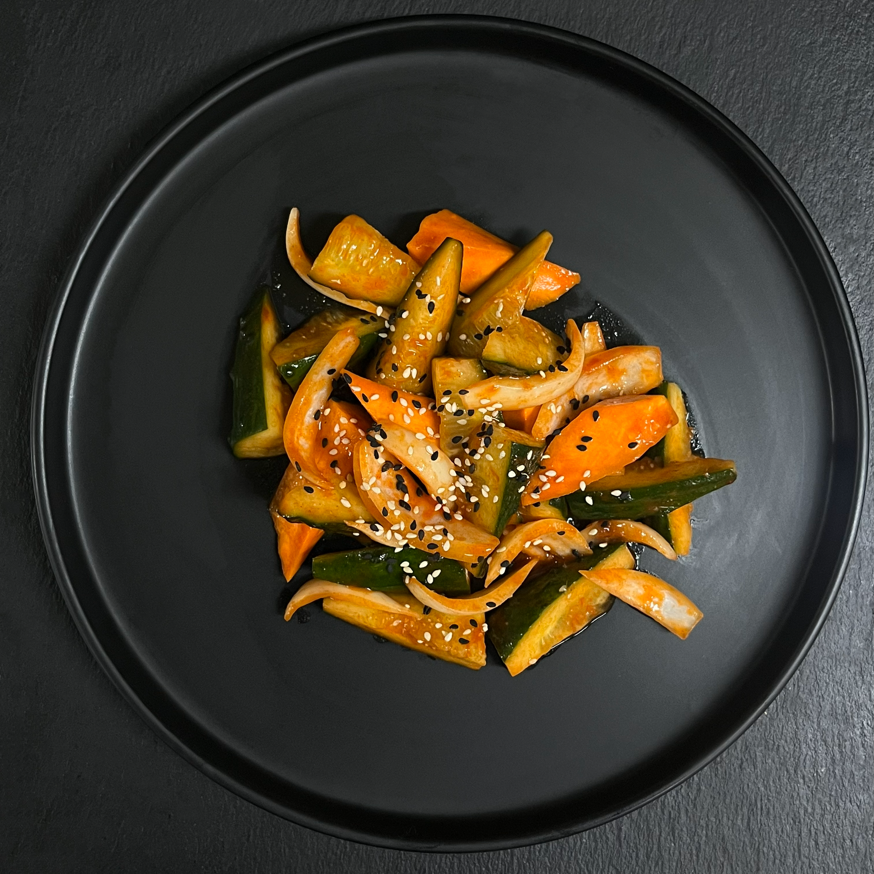 огурец, морковь, лук репчатый, паста кочудян, кунжут
