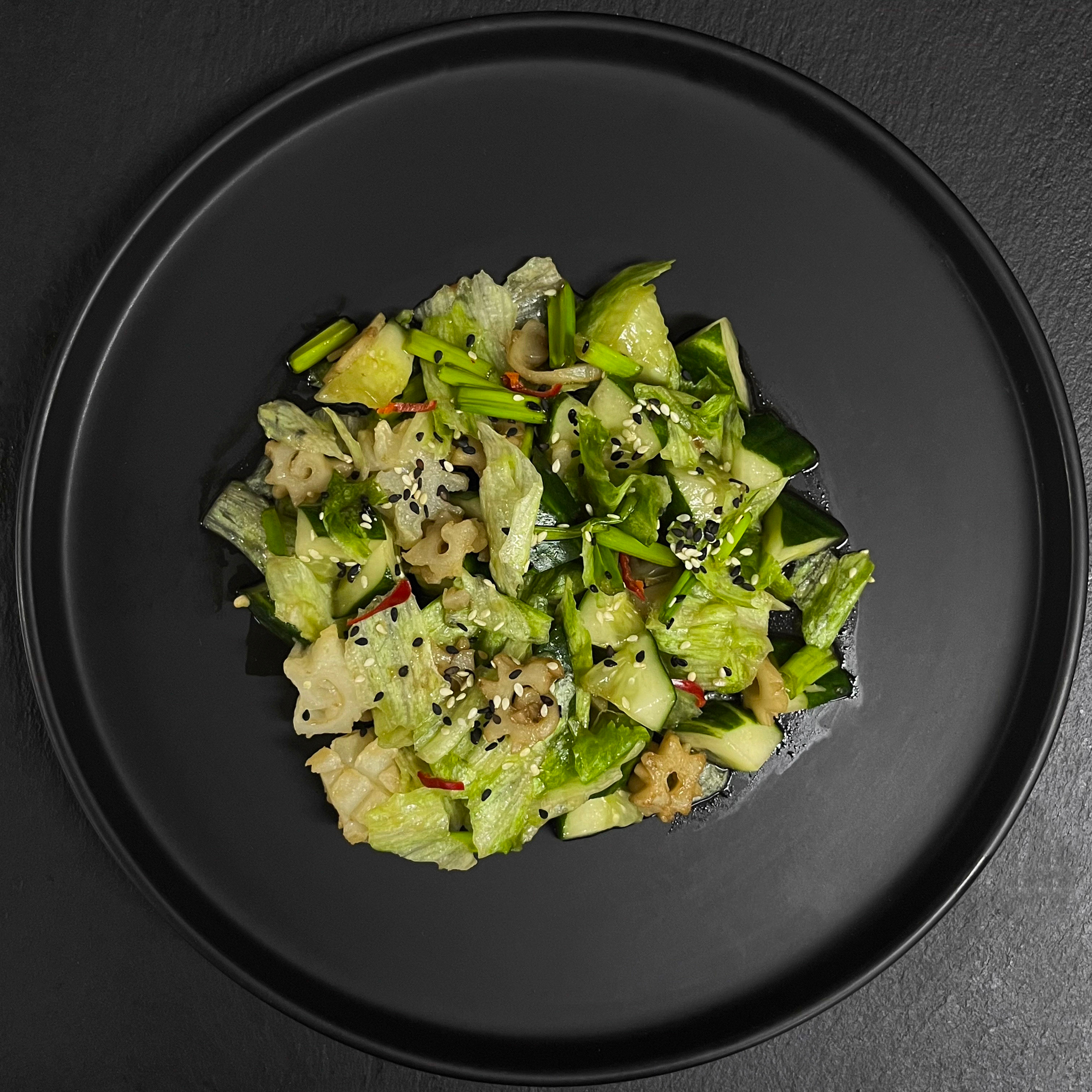 кальмар, огурец, айсберг, зелёный лук, перец чили, масло чесночное, масло кунжутное, соевый соус