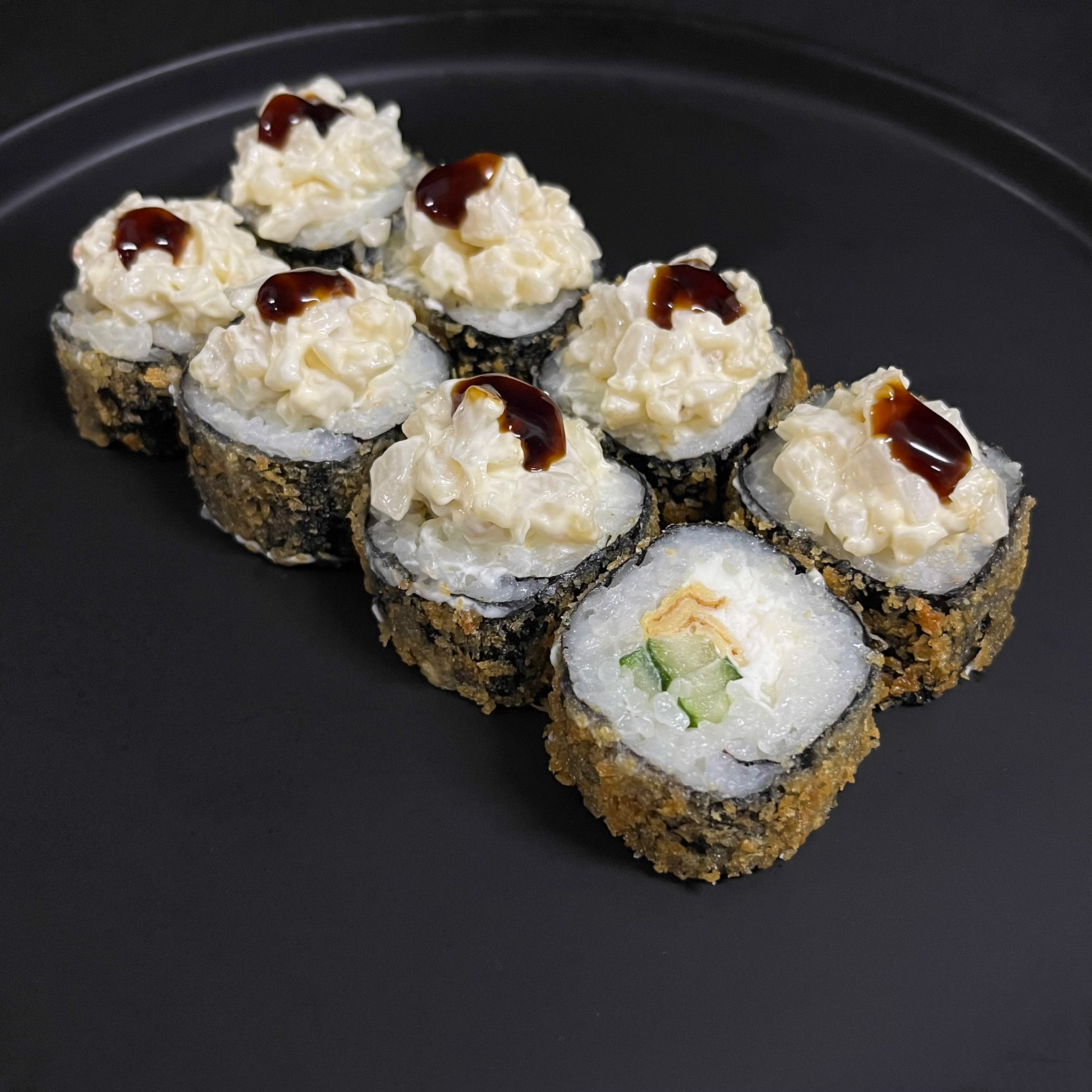 рис, нори, кальмар, японский омлет, сыр креметте, огурец, сливочно-чесночный соус, соус унаги, кляр, панировка