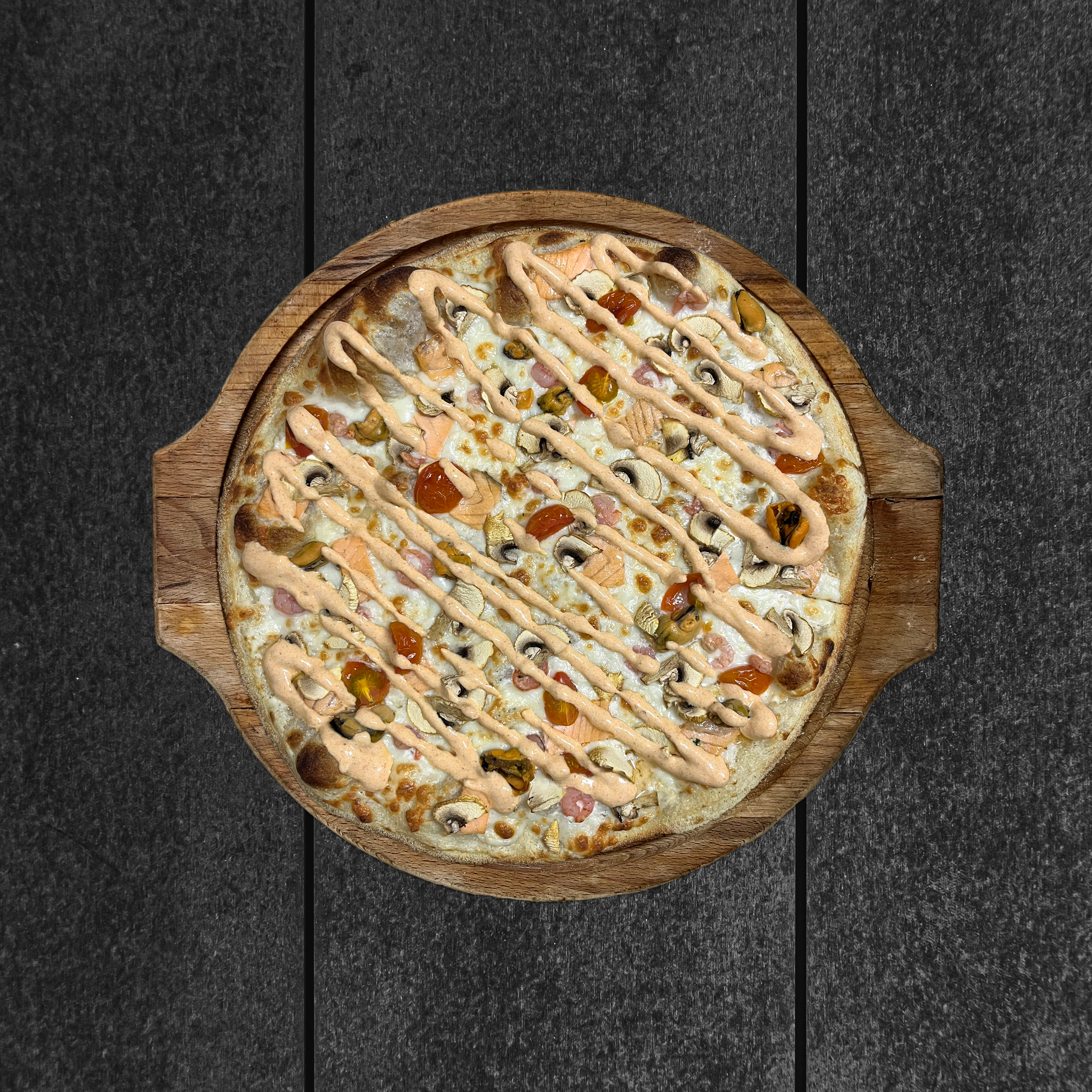 (32 см), тесто, креветки коктейльные, мидии, лосось, шампиньоны, черри, сыр моцарелла, сливочный соус, соус том ям