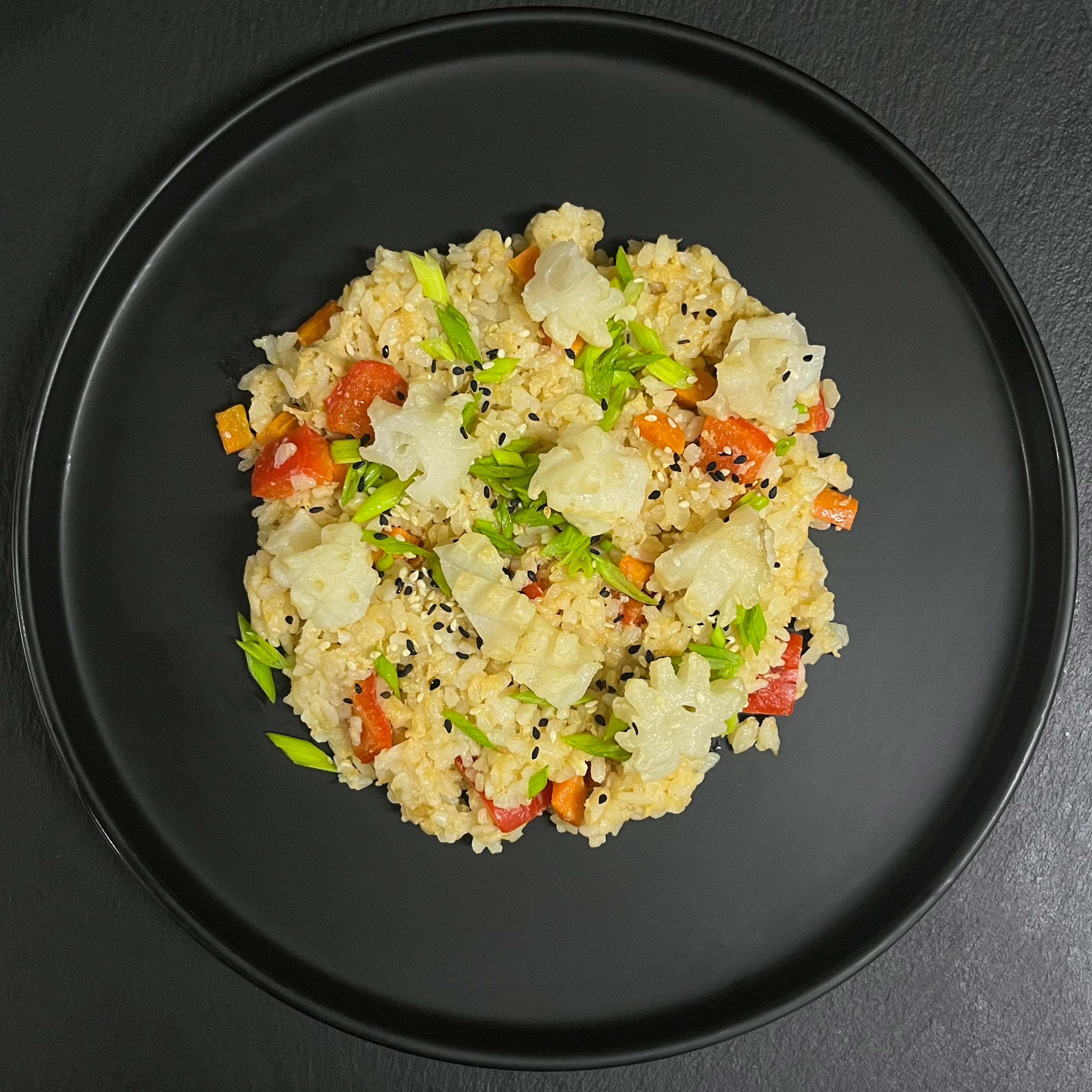 рис, кальмар, перец болгарский, морковь, зелёный лук, кунжут, кунжутное масло, куриное яйцо, соевый соус