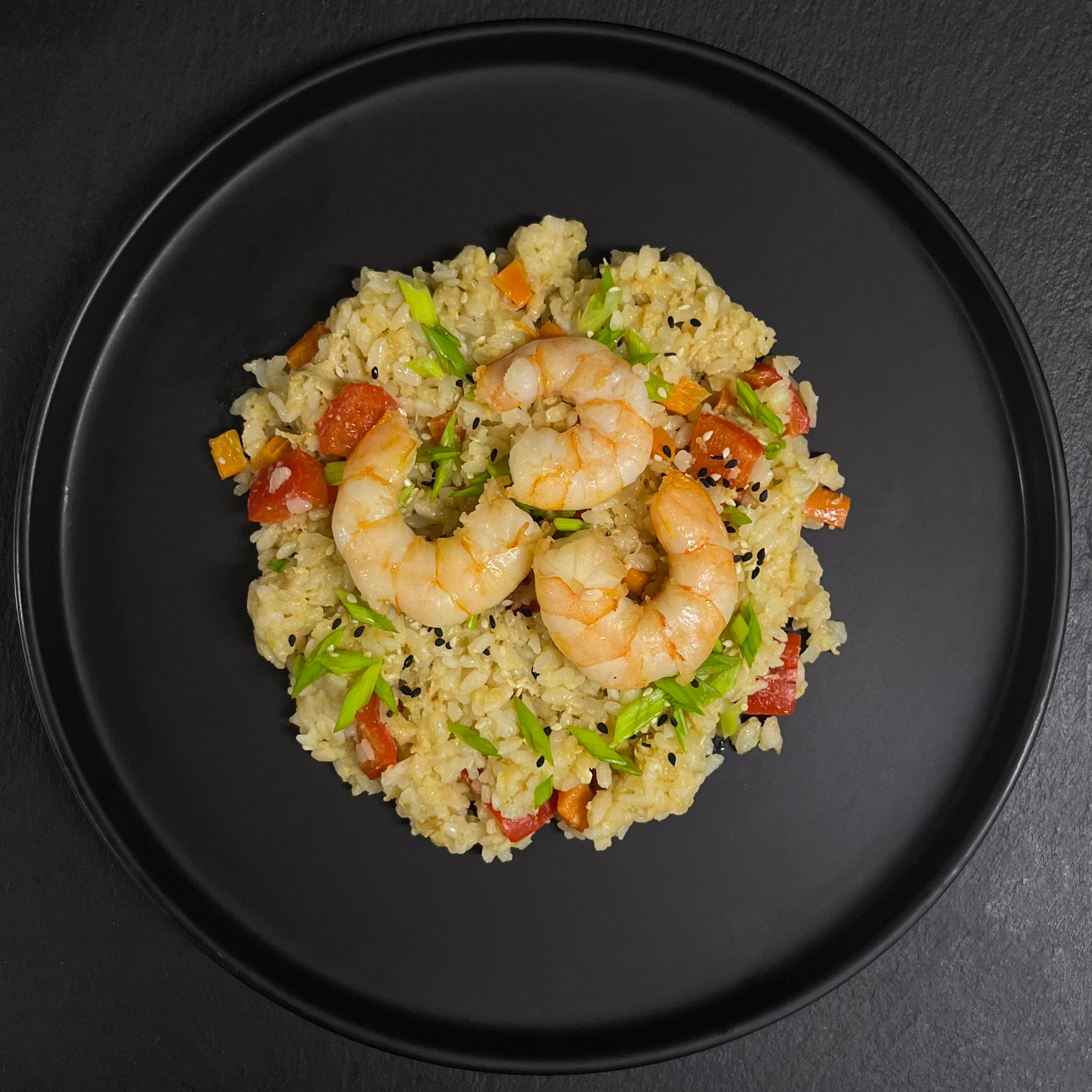 рис, тигровая креветка, перец болгарский, морковь, зелёный лук, кунжут, кунжутное масло, куриное яйцо, соевый соус