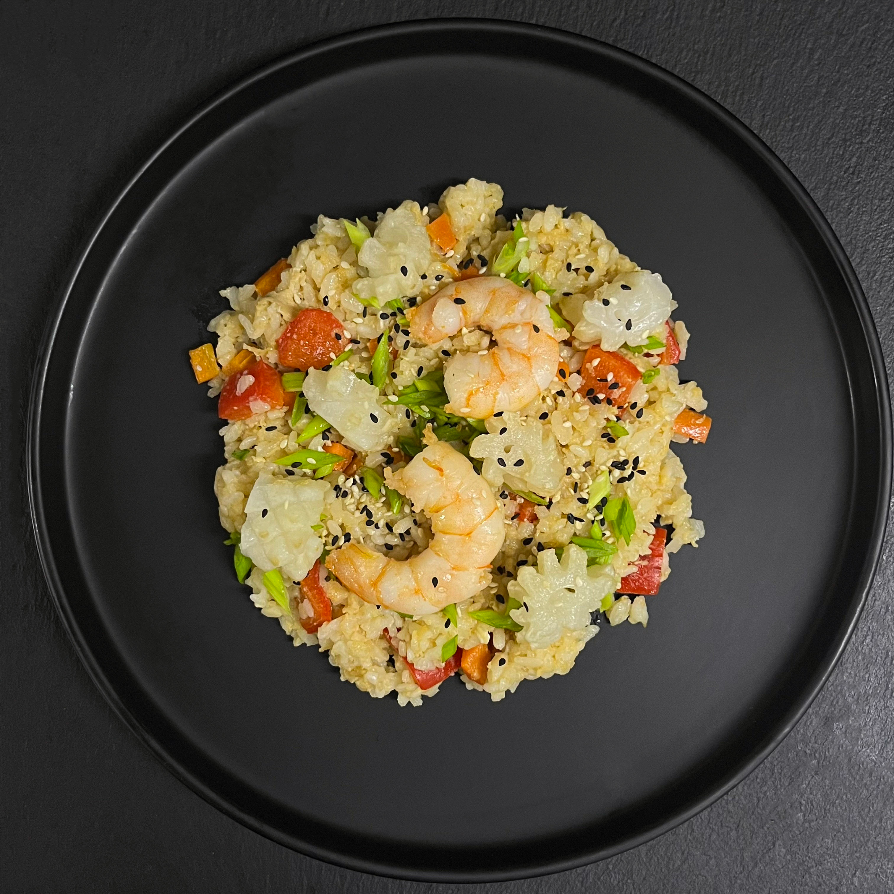 рис, тигровая креветка, кальмар, перец болгарский, морковь, зелёный лук, кунжут, кунжутное масло, куриное яйцо, соевый соус