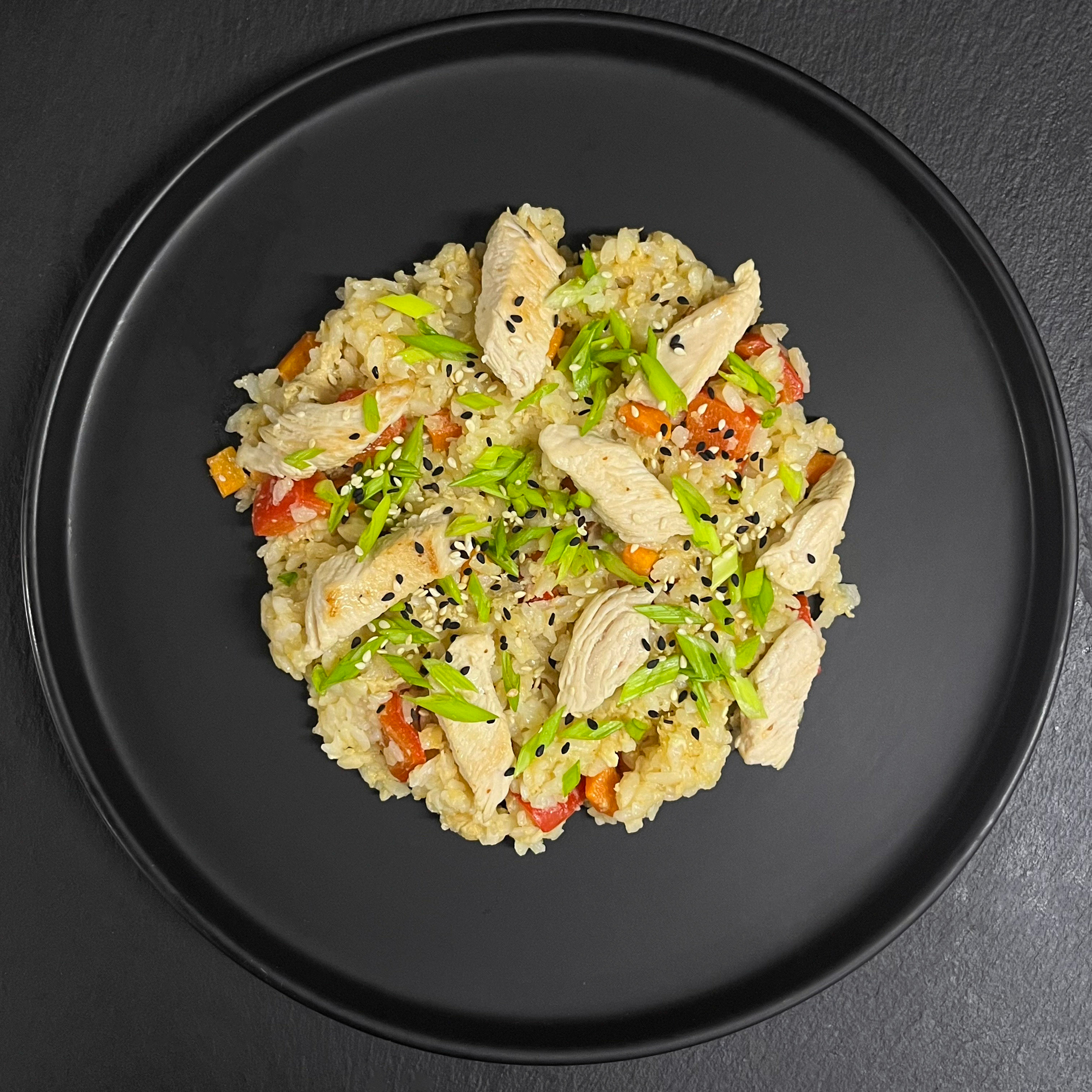 рис, курица, болгарский перец, морковь, зелёный лук, кунжут, кунжутное масло, куриное яйцо, соевый соус