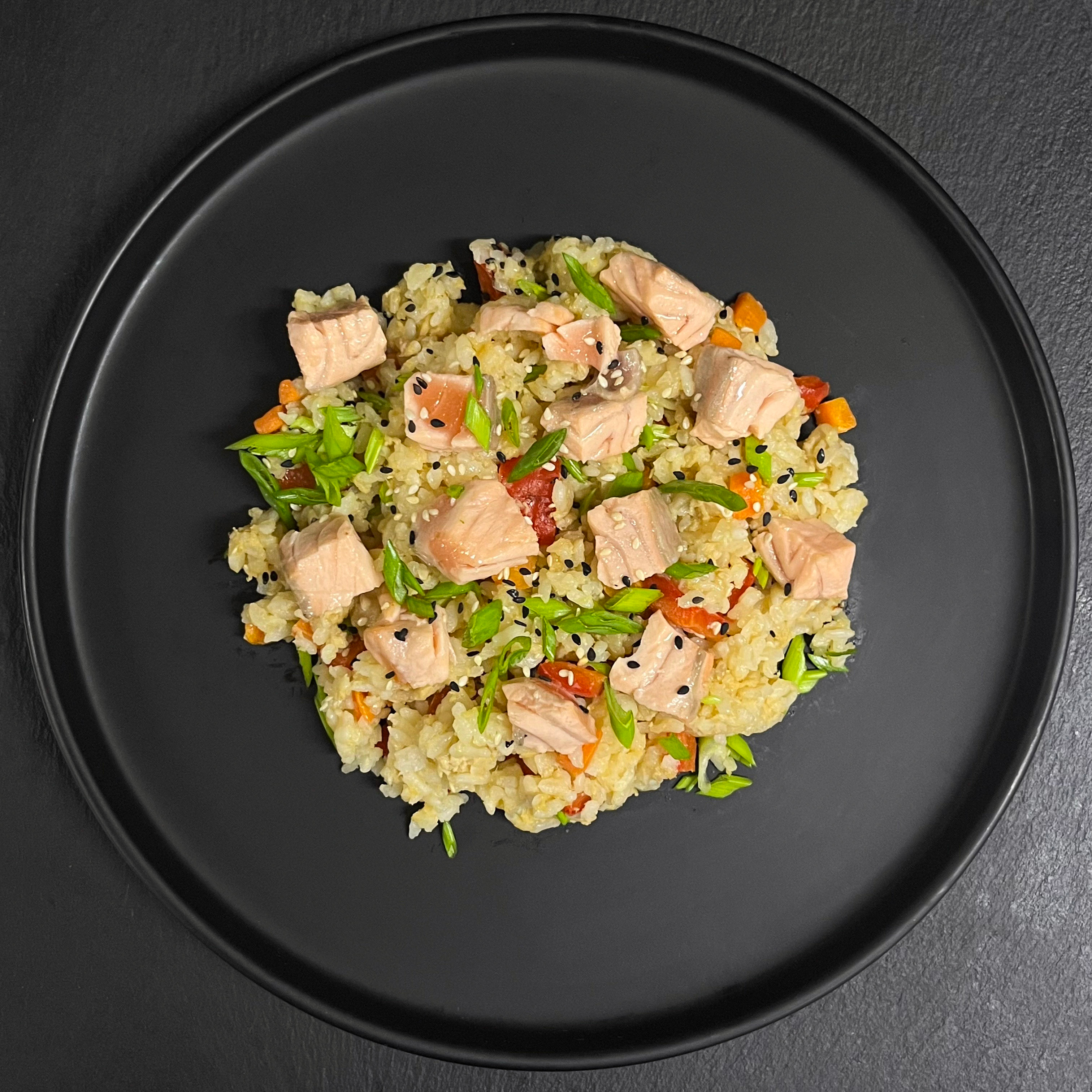 рис, лосось, болгарский перец, морковь, зелёный лук, кунжут, кунжутное масло, куриное яйцо, соевый соус