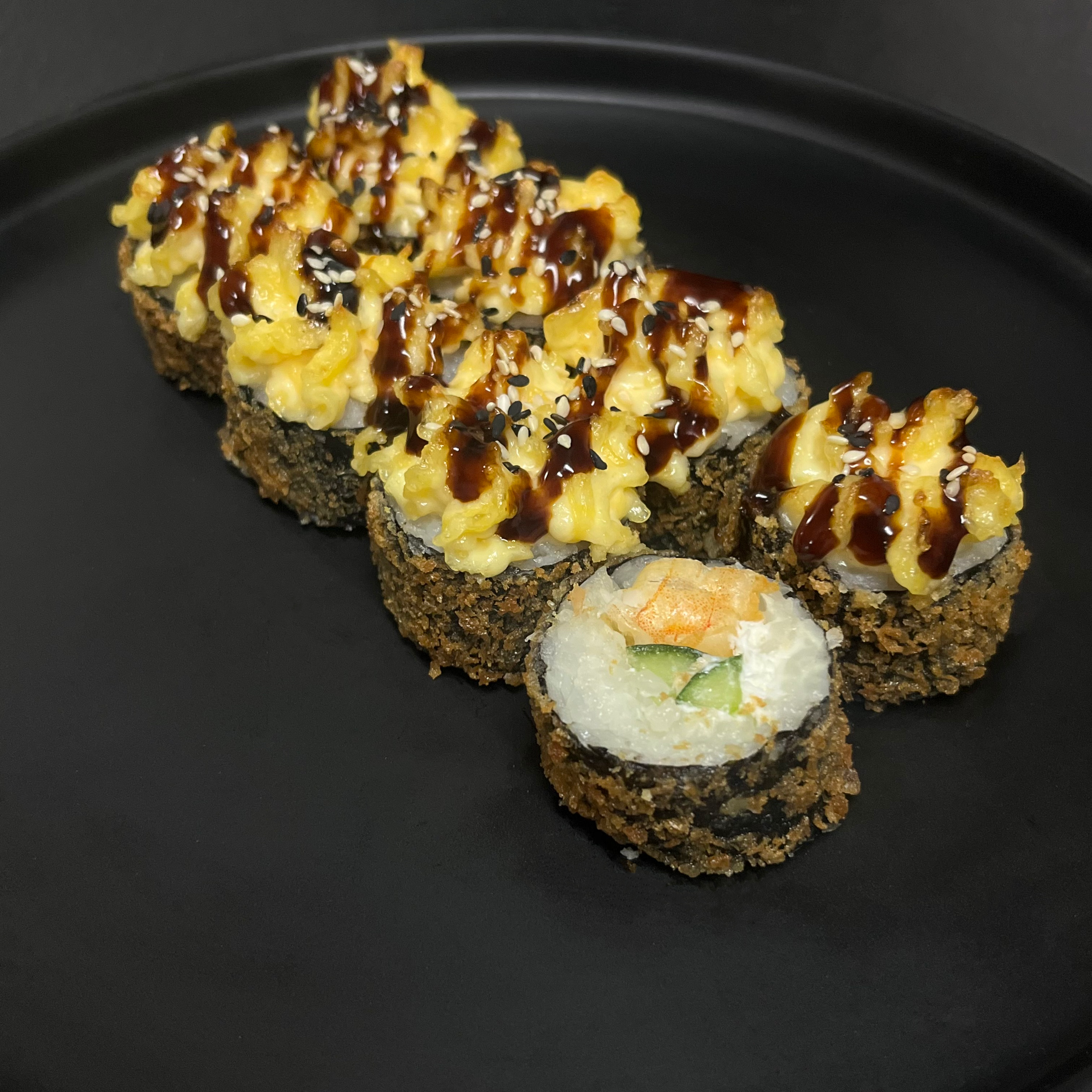 рис, нори, тигровая креветка, сыр креметте, огурец, соус унаги, кунжут, кляр, панировка
