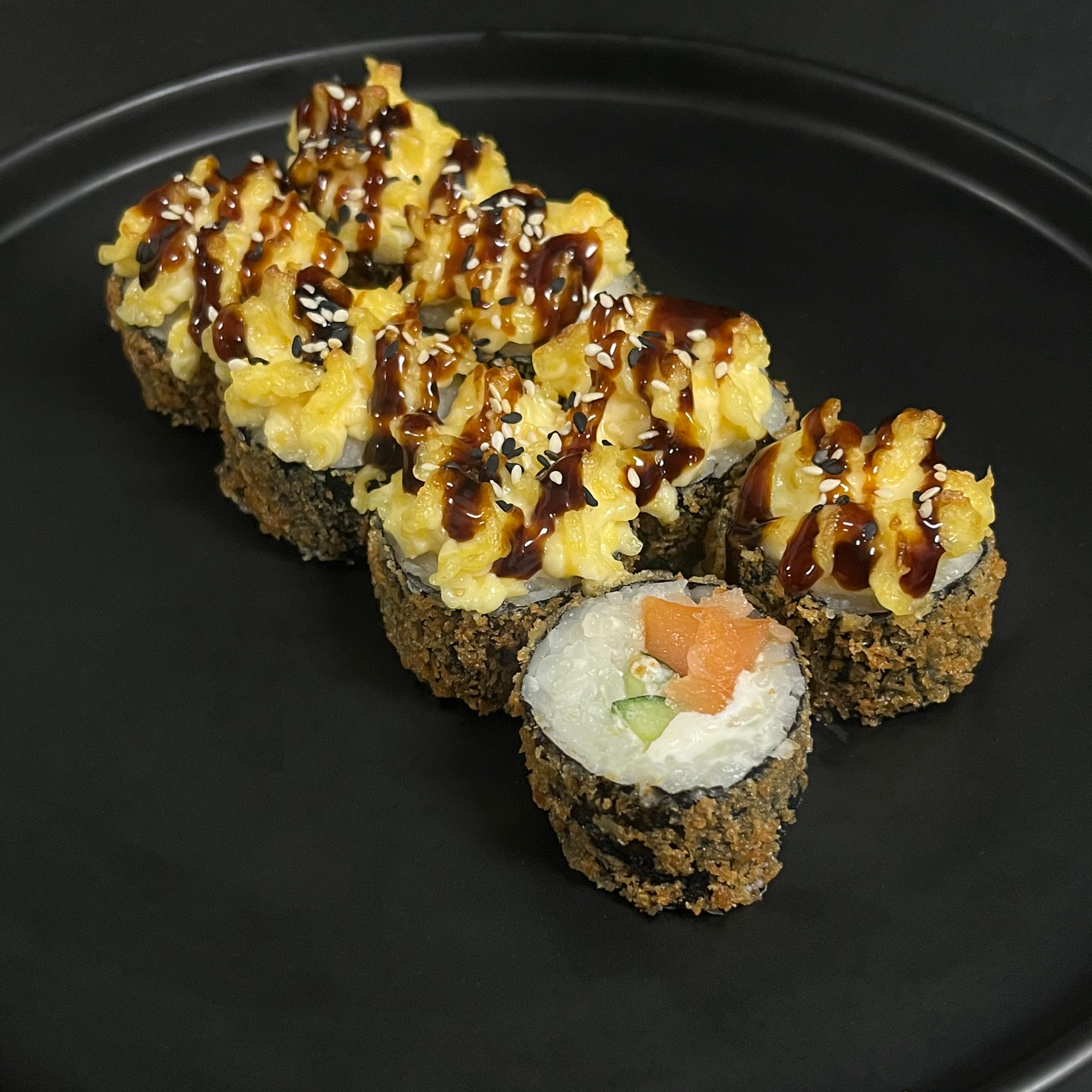 рис, нори, лосось, сыр креметте, огурец, соус унаги, кунжут, кляр, панировка